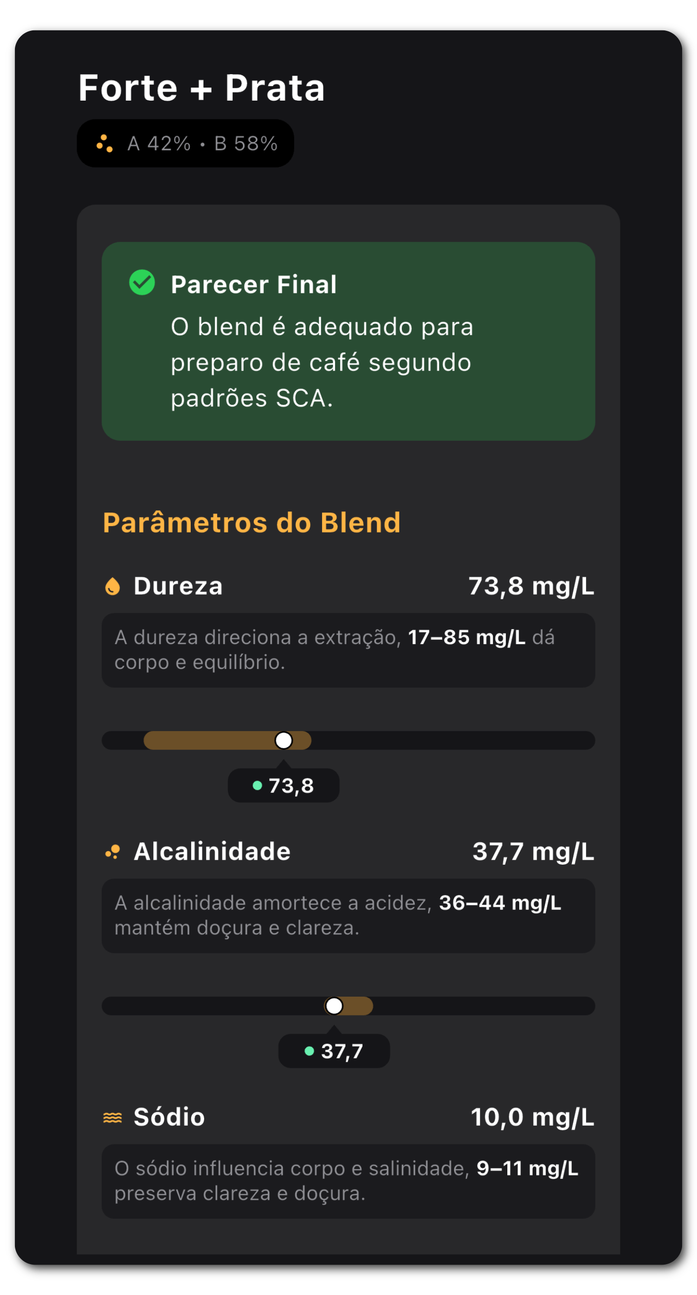 O app analisa em tempo real se a água é adequada para café, comparando com os parâmetros recomendados pela Specialty Coffee Association (SCA).
